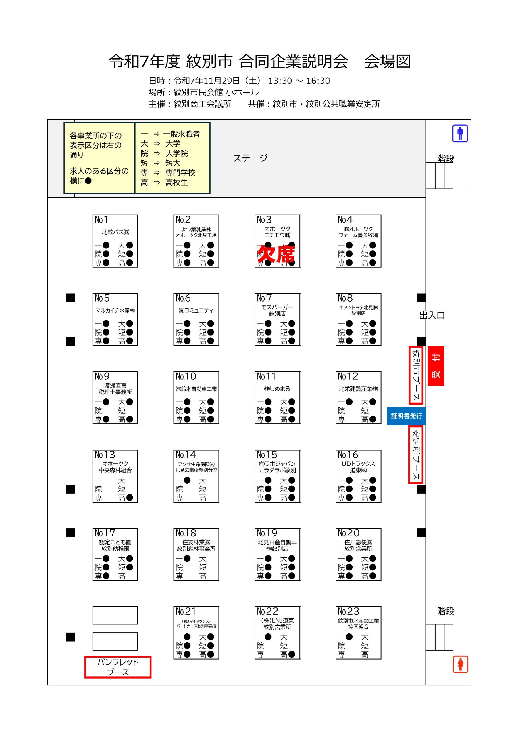 参加企業が個別のブースを設置し、会社概要や求人内容について説明を行う「合同企業説明会・面接会」形式で実施します。
