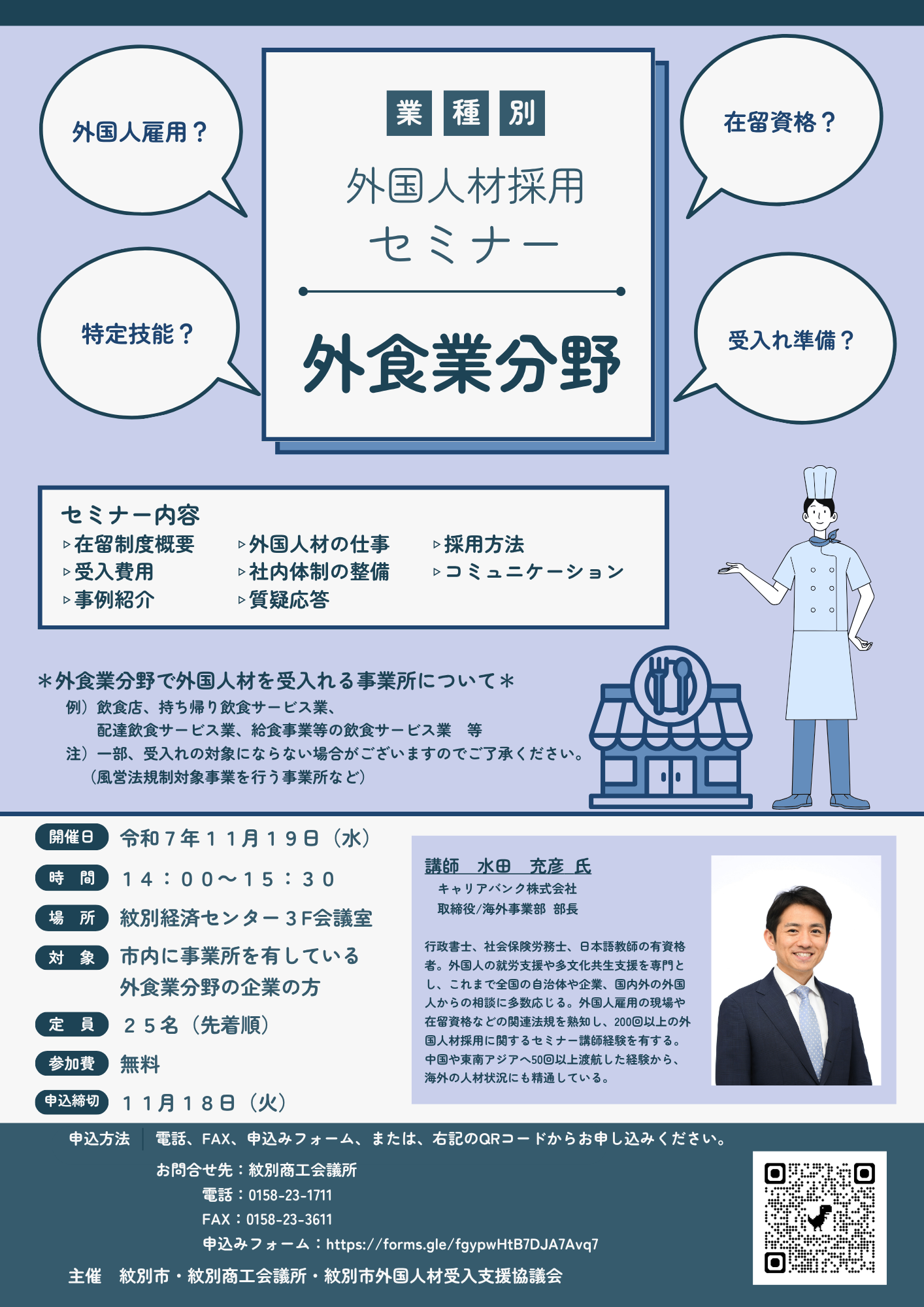 紋別市、紋別商工会議所、紋別市外国人材受入支援協議会が主催する、外食業分野を対象とした外国人材採用セミナーを実施します。詳細はチラシをご覧ください。