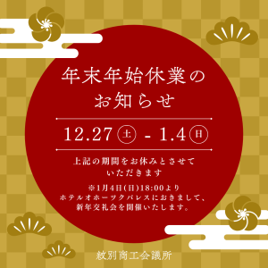 当所の年内業務は12月26日(金)をもちまして終了し、2026年1月5日(月)より業務開始となります。
